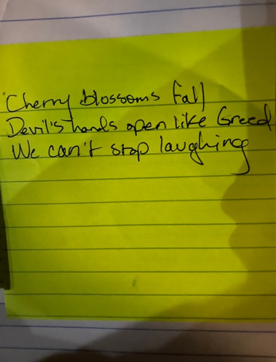 “Your tongue bites like snakes.Heart erupts like Mt. Fugi.I will master both.” Jameson Den Hartog (post-it poem on my phone…