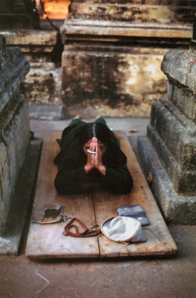 “Bowing is a common practice in Asia, both within and outside religious circles, a way of expressing respect and reverence, as well as a form of greeting. Tibetans bow and say tashi delek, meaning “excellent luck and auspicious good fortune to you.” Disciples and devotees bow to their teachers, to the gods, and to holy icons.